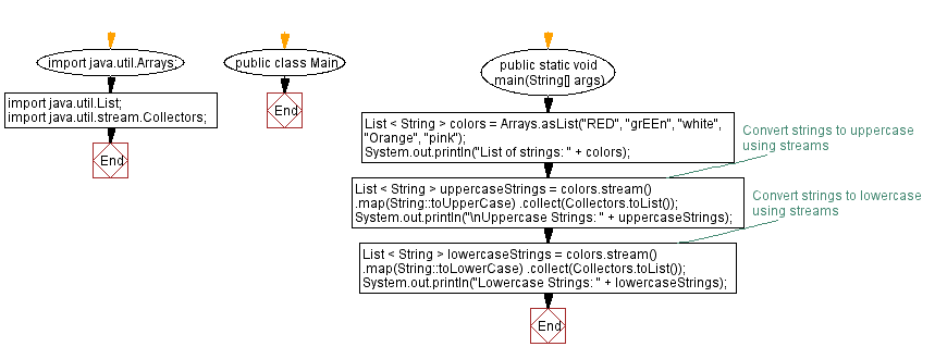In the above exercises, we have a list of strings containing ("RED", "grEEn", "white", "Orange", "pink"). Using streams. First convert the strings to uppercase by calling the toUpperCase method on each string, and then collect the results into a new list using the collect method. Similarly, convert the strings to lowercase by calling the toLowerCase method on each string. Finally, the uppercase and lowercase lists are printed to the console.