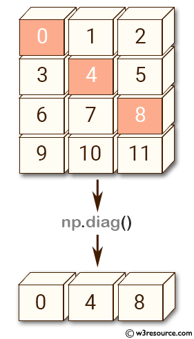 In this example, a 4x3 matrix a is created using arange() and reshape(). The diag() function extracts the main diagonal elements of a.