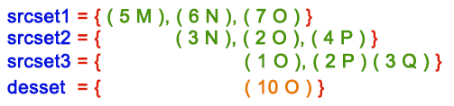 127.0.0.1:6379> ZADD srcset1 5 M 6 N 7 O (integer) 3 127.0.0.1:6379> ZADD srcset2 3 N 2 O 4 P (integer) 3 127.0.0.1:6379> ZADD srcset3 1 O 2 P 3 Q (integer) 3 127.0.0.1:6379> ZINTERSTORE desset 3 srcset1 srcset2 srcset3 (integer) 1 127.0.0.1:6379> ZRANGE desset 0 -1 WITHSCORES 1) "O" 2) "10"