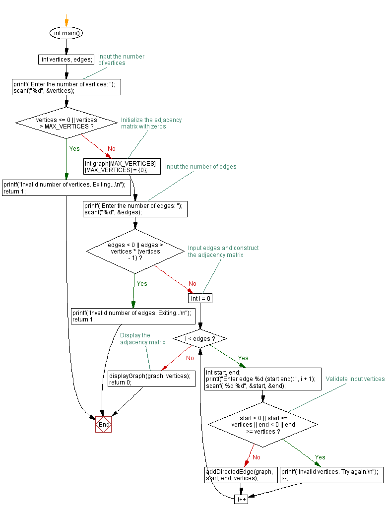 - If valid, it adds a directed edge from the 'start' vertex to the 'end' vertex by updating the corresponding entry in the adjacency matrix.