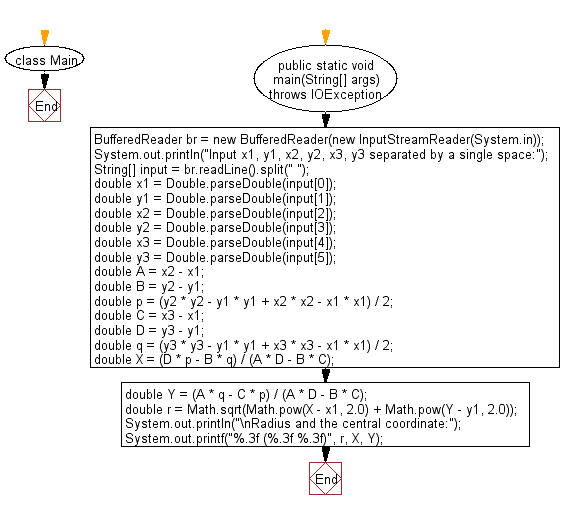 Write a Java program to compute the radius and central coordinates (x, y) of a circle constructed from three given points on the plane surface.