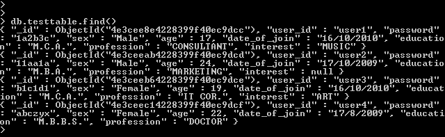 The above output shows that two documents have fetched. In the first document, the value of 'interest' is 'null' but in the second one 'interest' column does not exist.