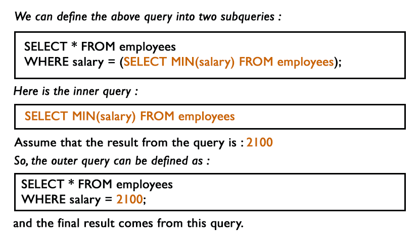 - The subquery (inner query) executes once before the main query (outer query) executes.